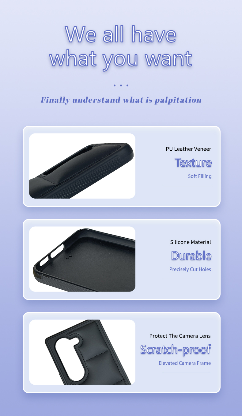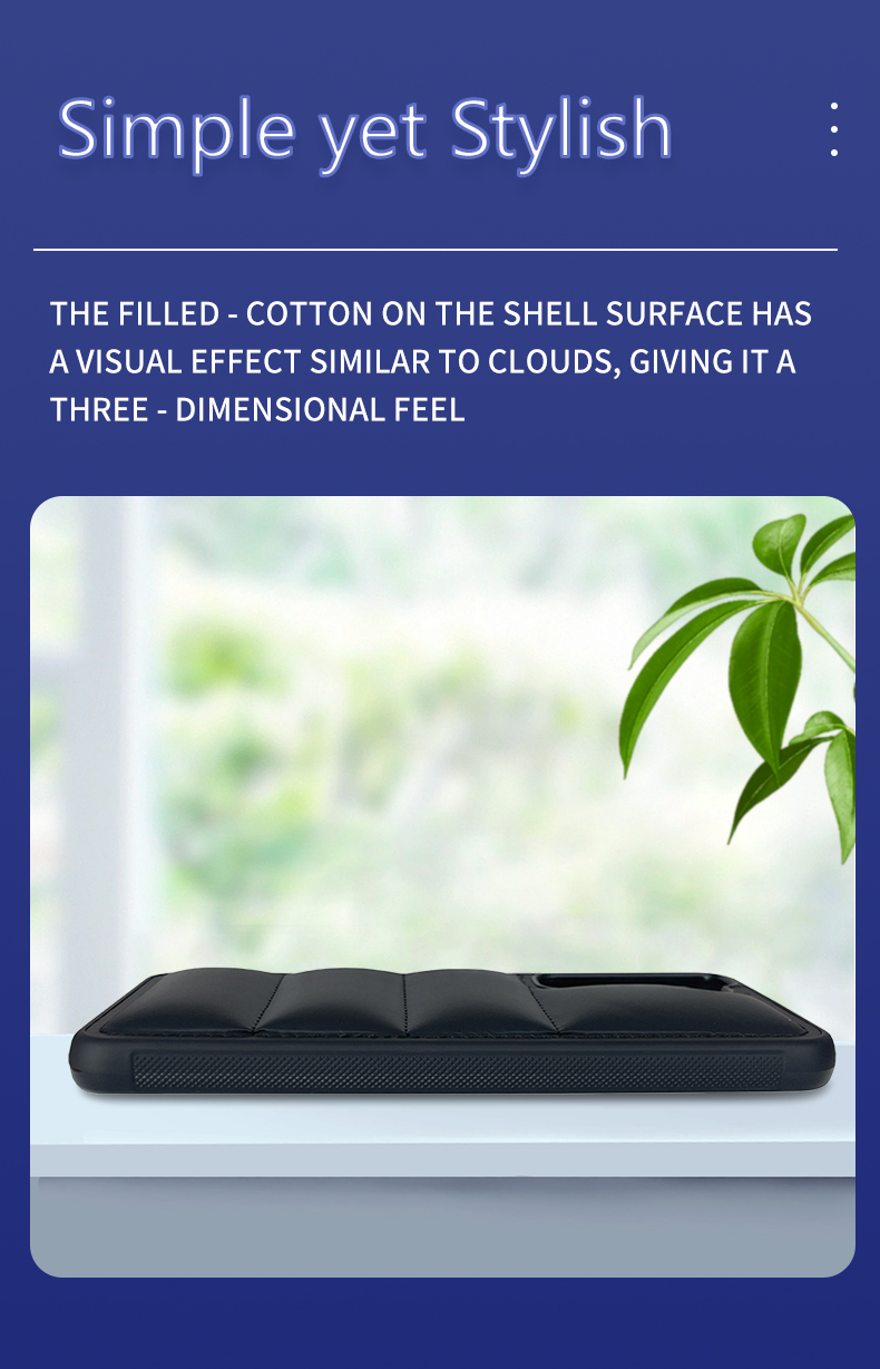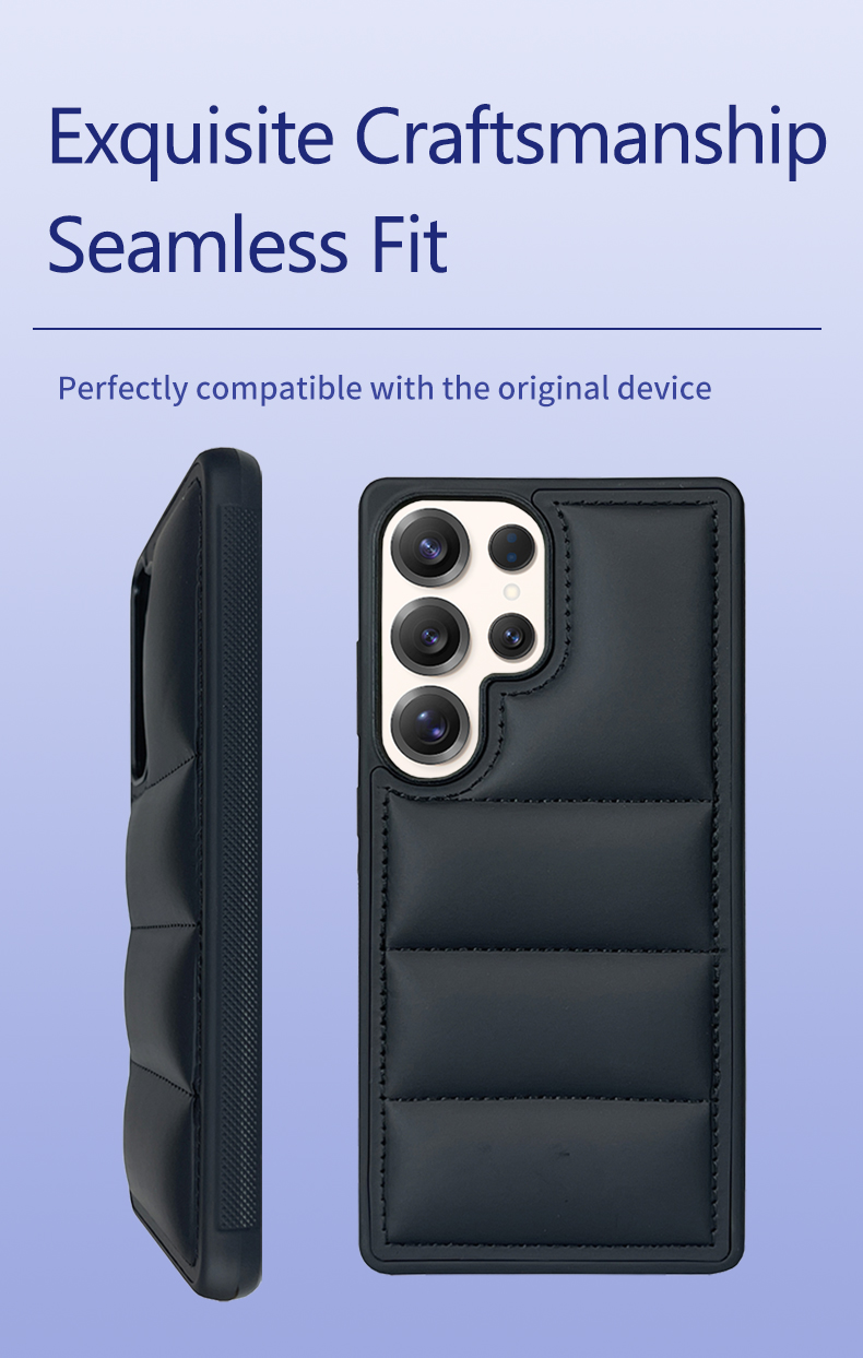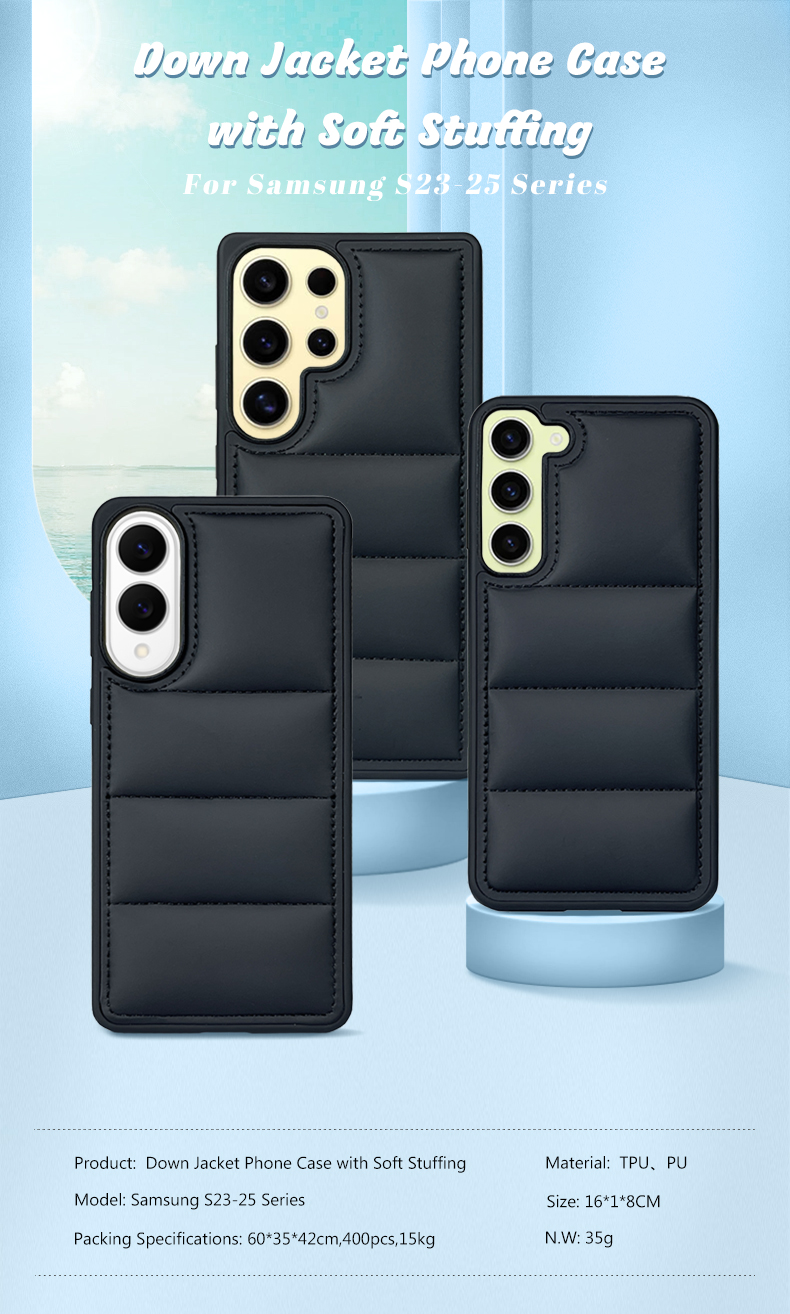 This phone case features a unique padded down jacket design, crafted with PU material and wave-patterned quilting for a stylish, textured look. The black finish adds a sleek touch, while the padded structure provides gentle protection against minor bumps and scratches for Samsung S23-S25 series devices.