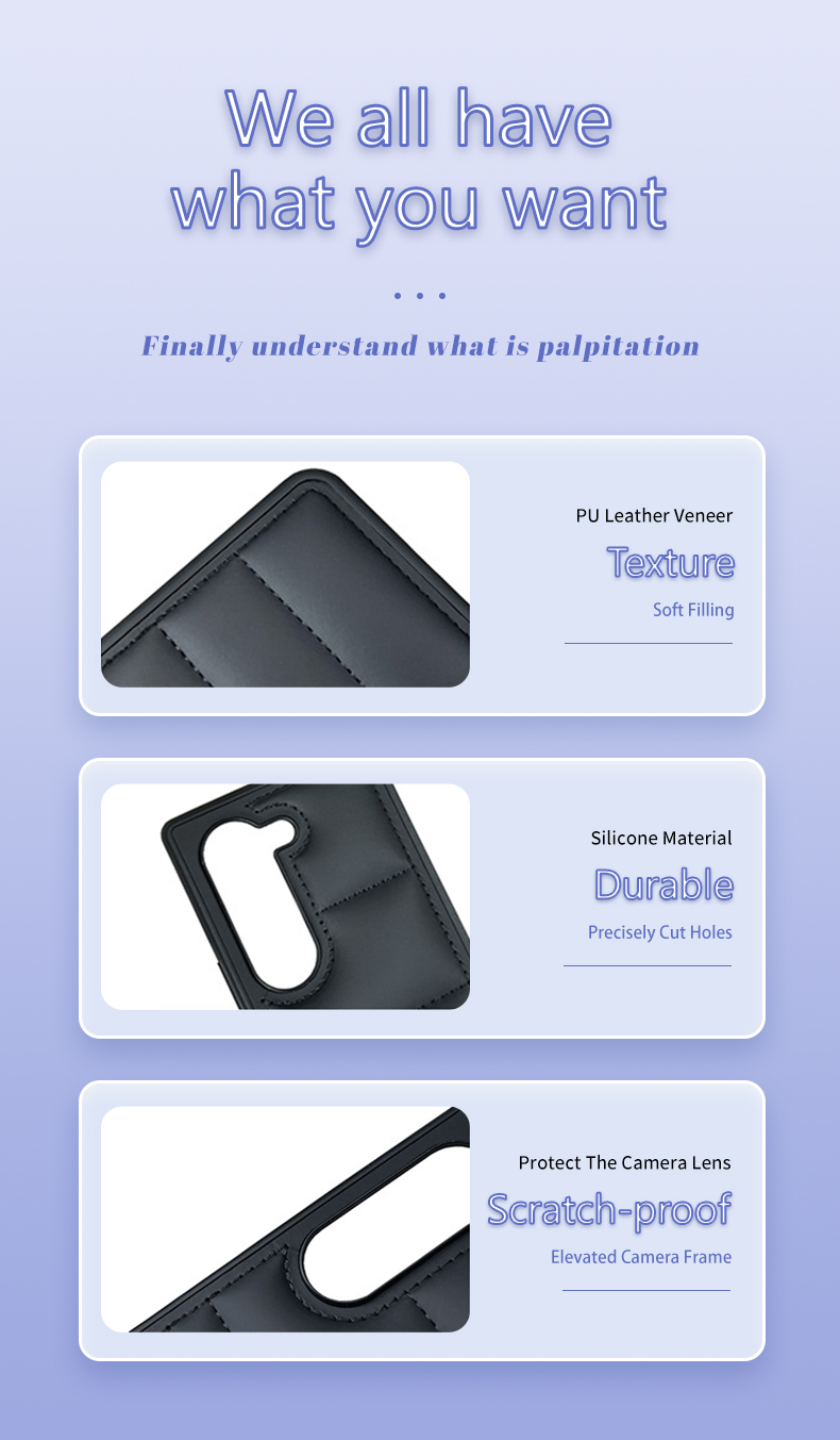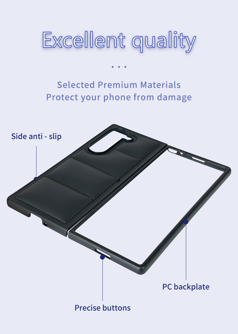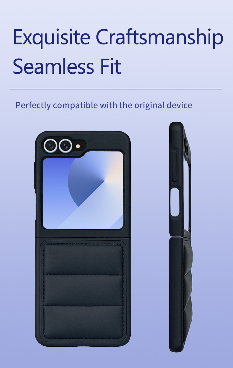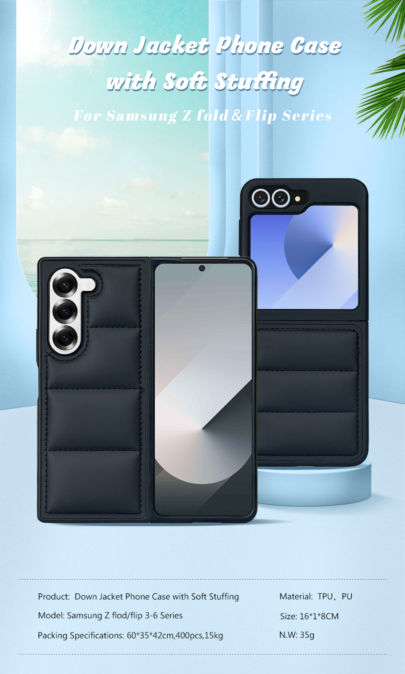 This phone case features a unique padded down jacket design, crafted with PU material and wave-patterned quilting for a stylish, textured look. The black finish adds a sleek touch, while the padded structure provides gentle protection against minor bumps and scratches for Samsung Z Flip 6/5/4/3, Z Fold 6/5/4/3 Series devices.
