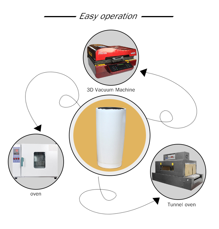 * You just need to cover the sublimation shrink wrap on mugs or other sublimation blanks. Then put them into the oven and design time and wait the finished products The process can be done at home, which is very simple,easy and economic