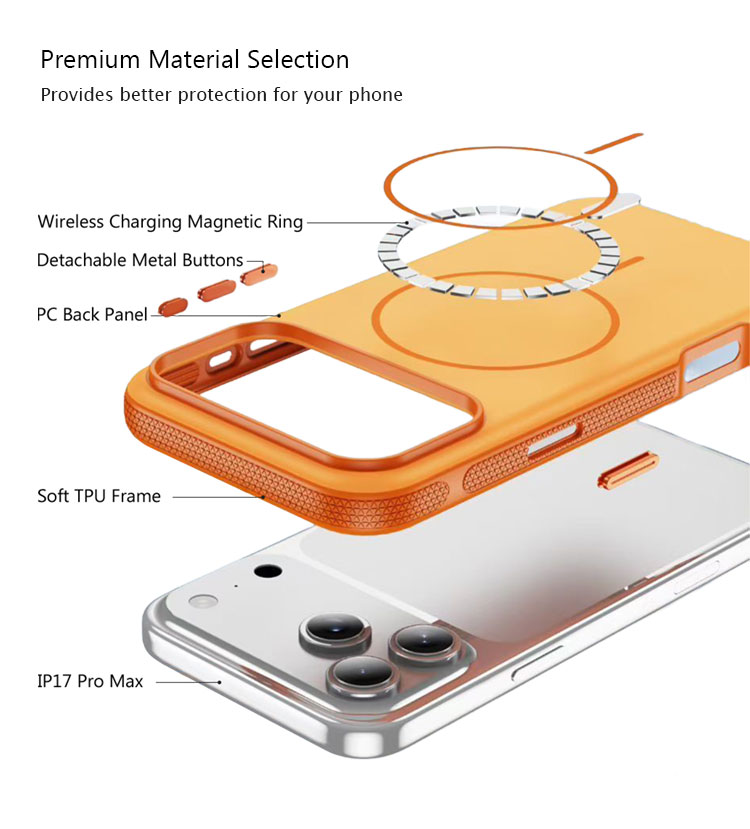 Constructed with a durable PC back panel and soft TPU frame, the case provides robust protection against drops, scratches, and everyday wear. The integrated magnetic ring ensures a secure connection to wireless chargers and magnetic mounts, while precise cutouts and detachable metal buttons offer full access to ports and a premium tactile experience.