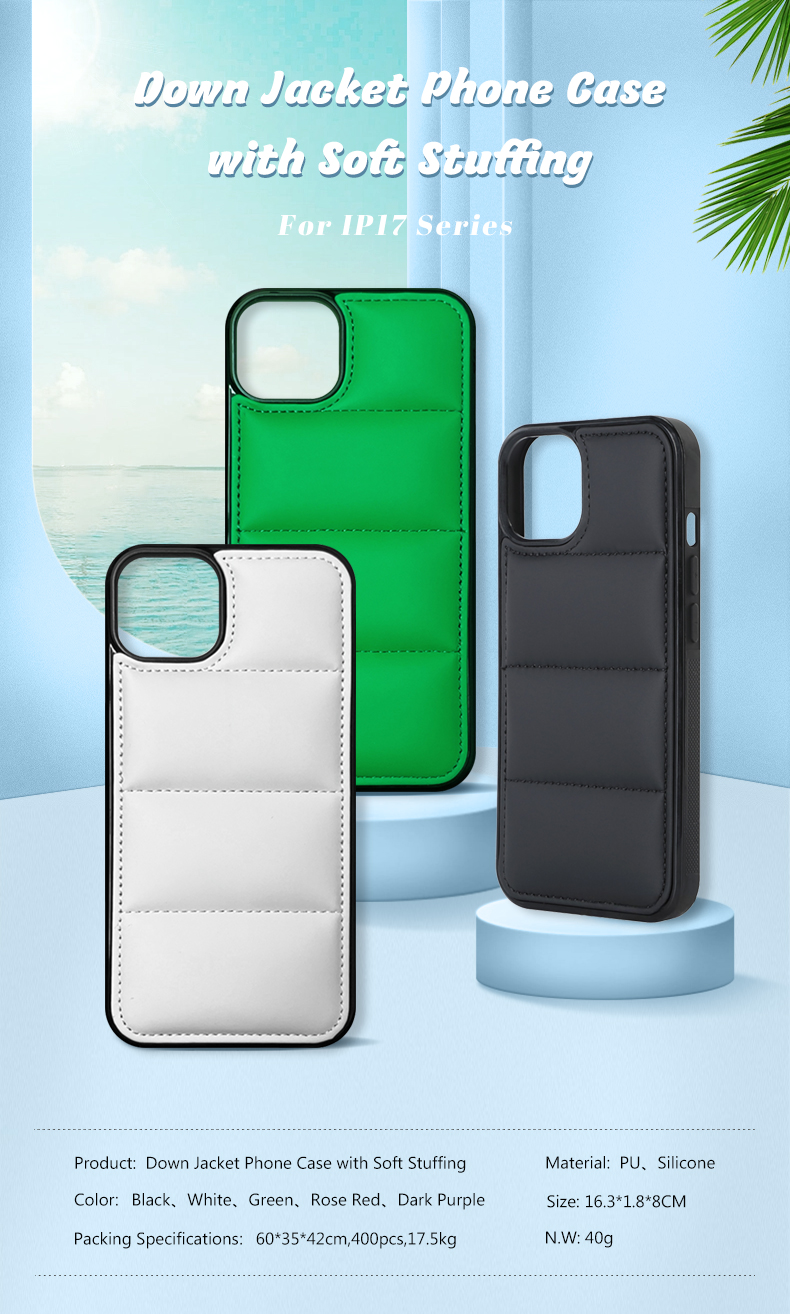 This phone case features a unique padded down jacket design, crafted with PU material and wave-patterned quilting for a stylish, textured look.